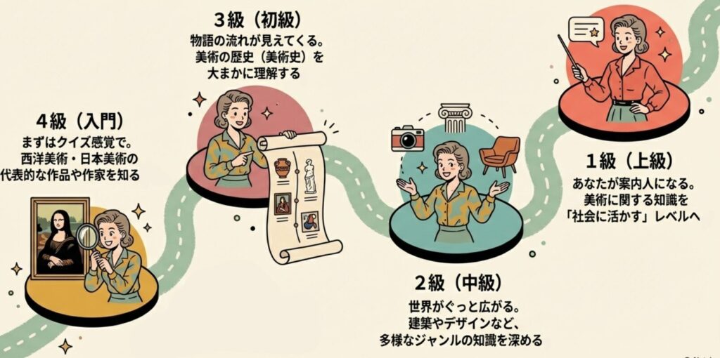 美術検定は、美術の知識や歴史、作品の背景を学ぶことで、鑑賞の質を高め、美術を楽しむ力を育むための検定です。4級から1級までの4段階に分かれています。