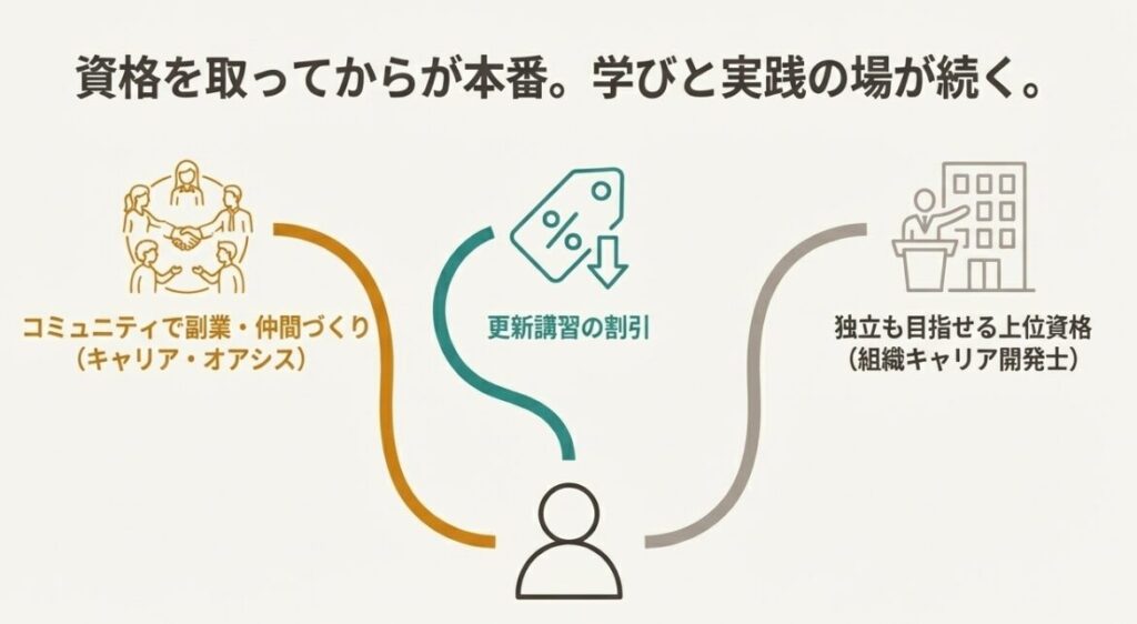 • 資格取得後の副業サポートや更新費用節約の仕組みも充実していて、「取っただけ」で終わらない!