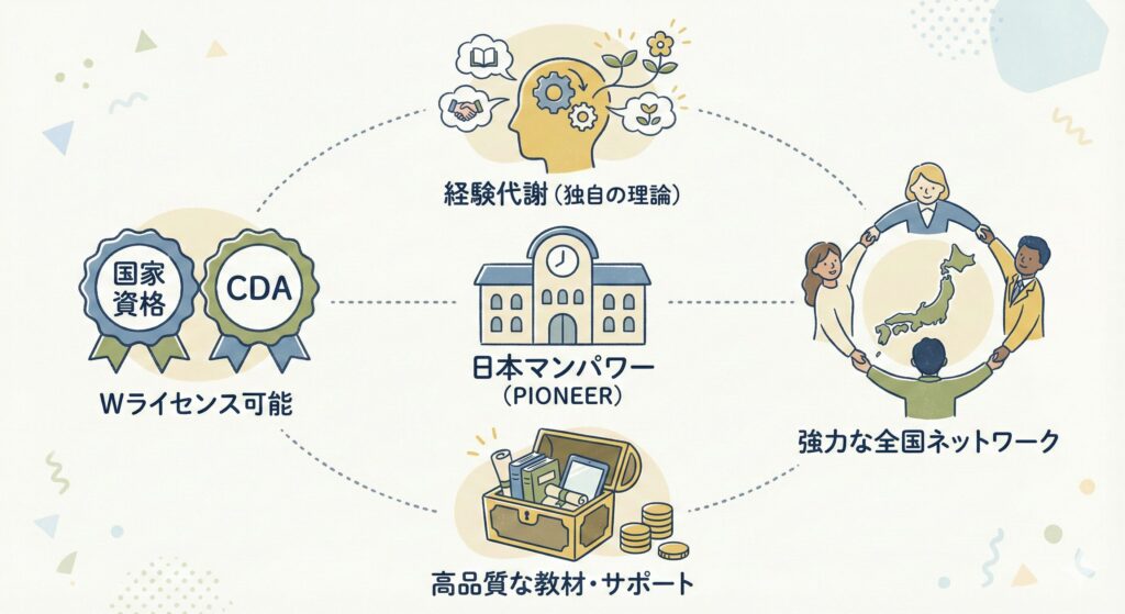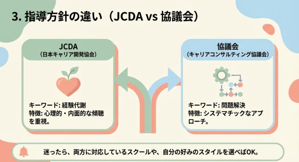 - JCDA(日本キャリア開発協会): 「経験代謝」を重視。心理的・内面的な傾聴を深く学ぶ。