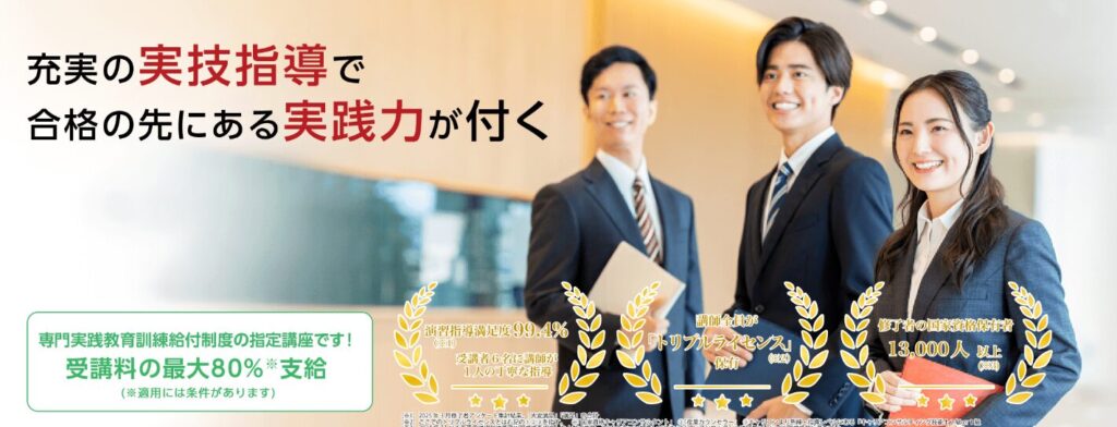 試験傾向を熟知したプロ講師と、図解豊富な教材で学科・実技ともに効率的に攻略できます。質問対応や自習室利用、振替受講などフォロー体制も万全。給付金制度も活用でき、高い合格実績と確かな指導力を求める方に最適な、学習に専念できる環境が整った講座です。