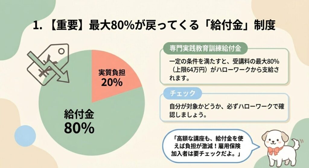「専門実践教育訓練給付金」は、一定の条件を満たすと、受講料の最大80%(上限64万円)がハローワークから支給される制度です。