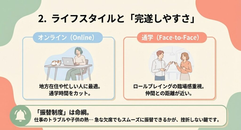 - 通学(対面): ロールプレイング(実技)の臨場感を重視したい人向け。