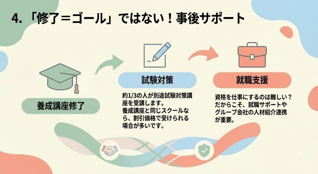 「講習修了=資格取得」ではありません。修了後の国家試験対策講座が充実しているか、また資格取得後の更新講習や就職支援があるかも比較の鍵です。