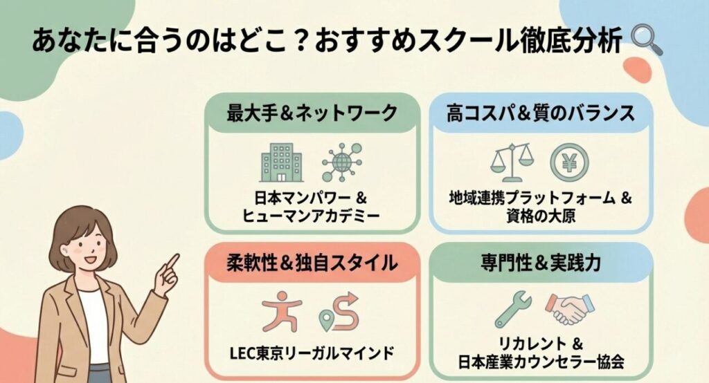 地域連携プラットフォームが「コスト」と「スピード」で優位性を持つのに対し、大手スクールは「ブランド力」「多様なチャネル」「特定のメソッド」で強みを発揮している。ここでは主要4社を詳細に分析する。