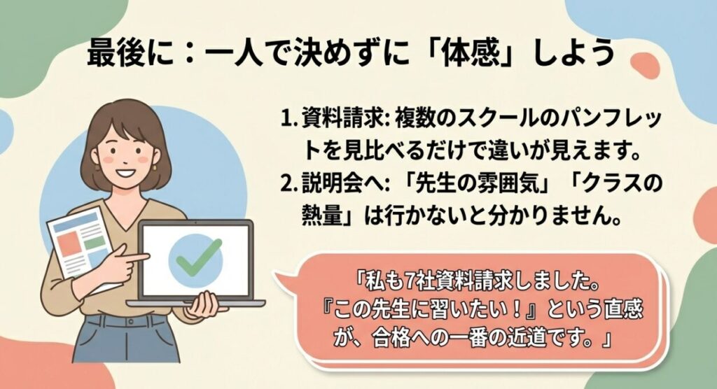 - 資料請求: 2〜3社取り寄せて、カリキュラムの進み方を比較する。