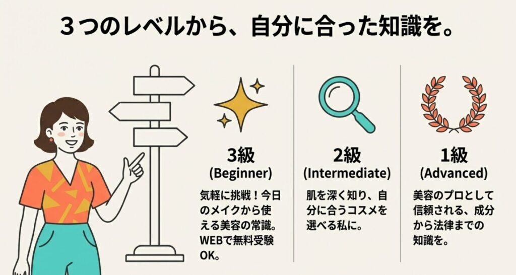 - 3級(初級): 今日のメイクから使える「美容の常識」がメイン。無料でWeb受験でき、まず挑戦するのに最適です。