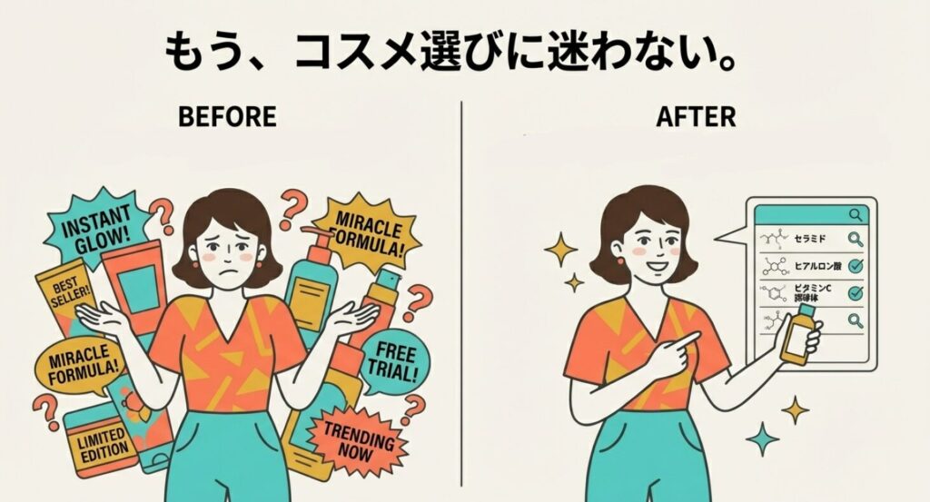 パッケージのキャッチコピーに惑わされず、成分表示を見て「今の自分の肌に必要なもの」を判断できるようになります。無駄買いが減り、最短距離で美肌を目指せます。